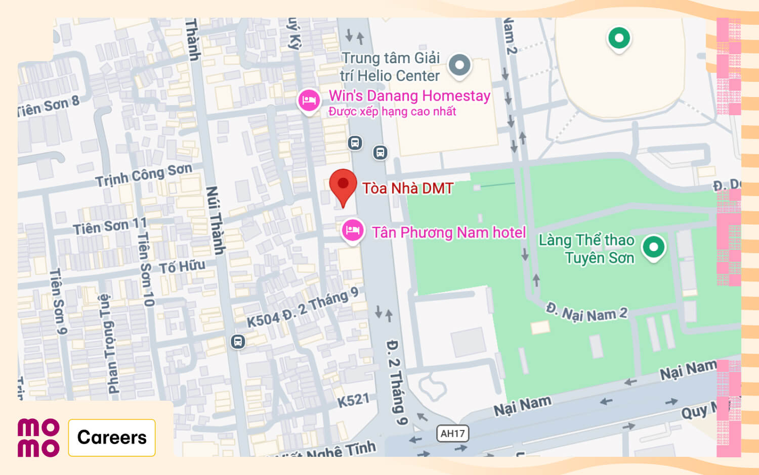 Không thể thiếu chi nhánh văn phòng MoMo tại Đà Nẵng tọa lạc tại Tầng 3, tòa nhà DMT, Số 484-486 đường 2/9, Phường Hòa Cường Nam, Quận Hải Châu, Thành phố Đà Nẵng. Tòa nhà DMT là một trong những tòa nhà văn phòng hiện đại tại trung tâm Đà Nẵng, nằm trên trục đường 2/9 - tuyến đường huyết mạch của thành phố, thuận tiện cho việc di chuyển và kết nối.